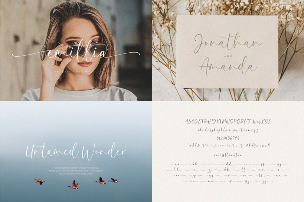 Affection is a charmish and stylish calligraphy font that come with its effortless swashes and simple yet captivating letterforms. Affection exudes a laid-back charm that effortlessly draws attention. This font perfect for wedding invitation, branding, cards, social media and many more.
